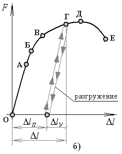 Если при испытании на растяжение нагружение приостановить, например, в точке Г диаграммы и осуществить разгружение образца, то окажется, что диаграмма разгружения и диаграмма предыдущего нагружения не совпадают. Линия разгружения в этом случае - прямая, параллельная начальному линейному участку диаграммы растяжения образца. Такой характер деформирования образца при его разгружении называется законом разгружения. При повторном нагружении диаграмма до точки Г совпадает с линией разгружения, а затем будет совпадать с диаграммой растяжения образца при однократном нагружении. Такой характер деформирования называется законом повторного нагружения и заключается в пропорциональной зависимости силы и удлинения, которая сохраняется до значения силы, достигнутой при первичном нагружении.
