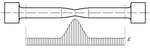 На конечном участке ДЕ (после возникновения шейки) происходит локализация деформаций в шейке, в остальной части образца они практически не увеличиваются. Деформация в шейке неоднородная, имеет существенный градиент вдоль оси образца. Напряженное состояние на этом участке становится неоднородным, кроме того, оно изменяется качественно - становится трехосным. Диаметр шейки уменьшается по мере деформирования образца, и образец разрывается по наименьшему сечению шейки.